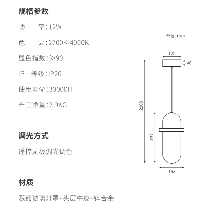 美时吊灯灵感源自早晨的光线,,,穿透云雾渺渺的大气层洒到地上。。。。美时外层的玻璃自上而下从深色到透明的渐变镀层还原了这一情境,,光透过双层玻璃形成丰富的折射效果,,一如破晓时的光线充满朝气,,采用上下两路光组合,,下路光直出提供主要光线,,,上路光提供氛围光。。。。上路光在手工吹制玻璃的不规则壁厚折射下,,,呈现了极其丰富的变化,,,采用头层牛皮作为一个点缀,,,,缓冲了玻璃与金属带来的冰冷和生硬的感觉,,取得了视觉的平衡。。